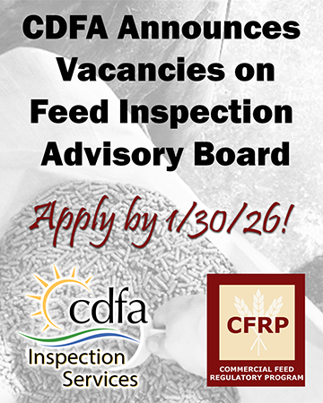 The California Department of Food and Agriculture (CDFA) announces three vacancies on the Feed Inspection Advisory Board (FIAB). This board makes regulatory and enforcement recommendations to CDFA to help ensure that commercial feed inspections contribute to a clean and wholesome supply of milk, meat and eggs.